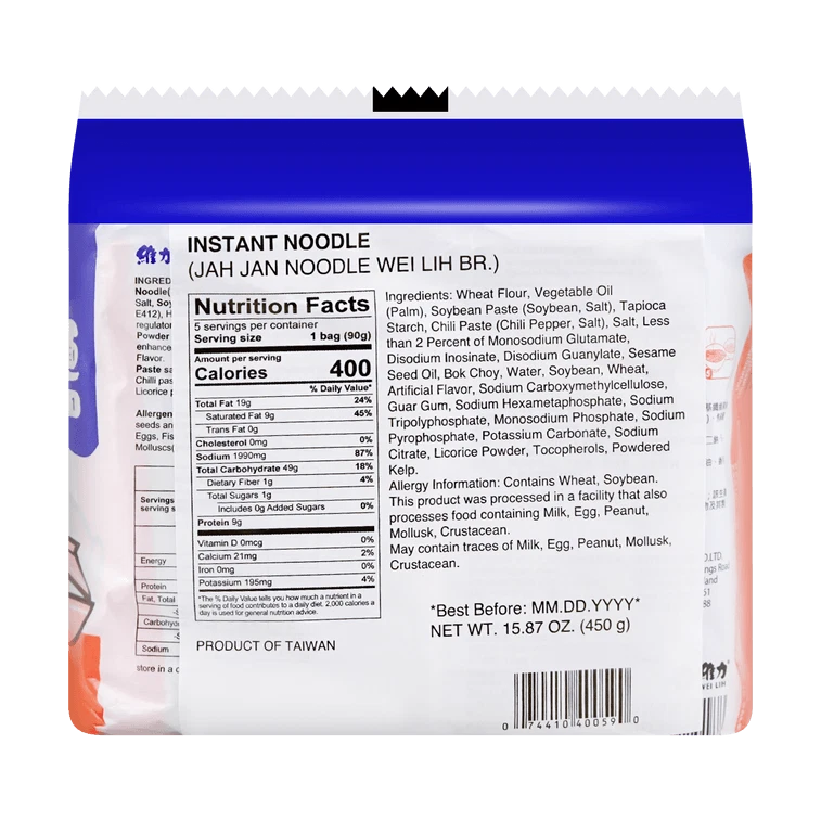 WEILIH Jah Jan Mien Jjajang Instant Ramen Noodle with Soybean Paste, 5 Bag, 450g